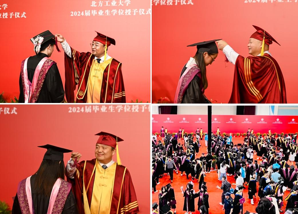 党委副书记、校长张立峰致辞。他祝贺2024届学生顺利完成学业,并现场做一次特殊的“点名”,向典礼当天生日的12名同学送上真挚的祝福。他表示,北方工大是同学们筑梦远航的起点、收获同学情谊的圣地,“青春工大”将成为大家人生中意义非凡的难忘经历。张立峰与师生共同回顾四年难忘的校园生活,赞扬同学们面对疫情肆虐时的挺膺担当、完成学业时的刻苦钻研、开展科学研究时的拼搏进取、投身“四大节”全面成长成才的激情绽放、面对挫折困难时的迎难而上,他动情地点出在各个领域表现优异的学生名字,将赞美和掌声送给他们,让同学们带着骄傲和荣耀告别母校。