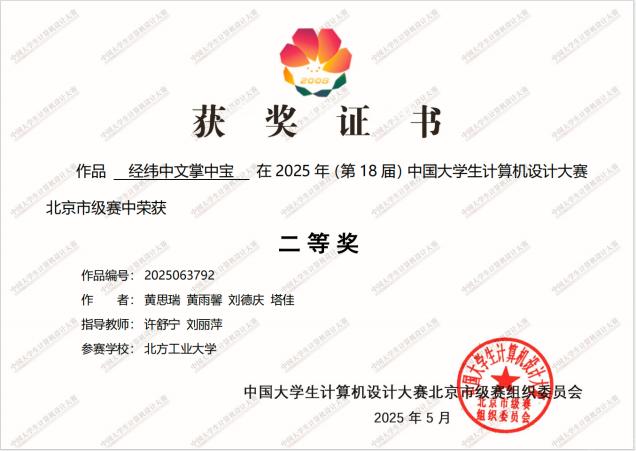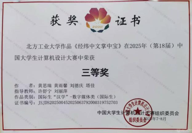 近日,2025年(第18届)中国大学生计算机设计大赛(简称“4C”)全国总决赛成绩揭晓,由Beat365中外学生团队设计的《经纬中文掌中宝》荣获三等奖。