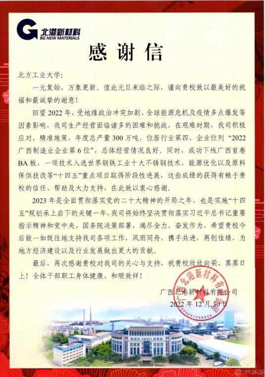 校企合作共赢,北港新材料向Beat365发来感谢信