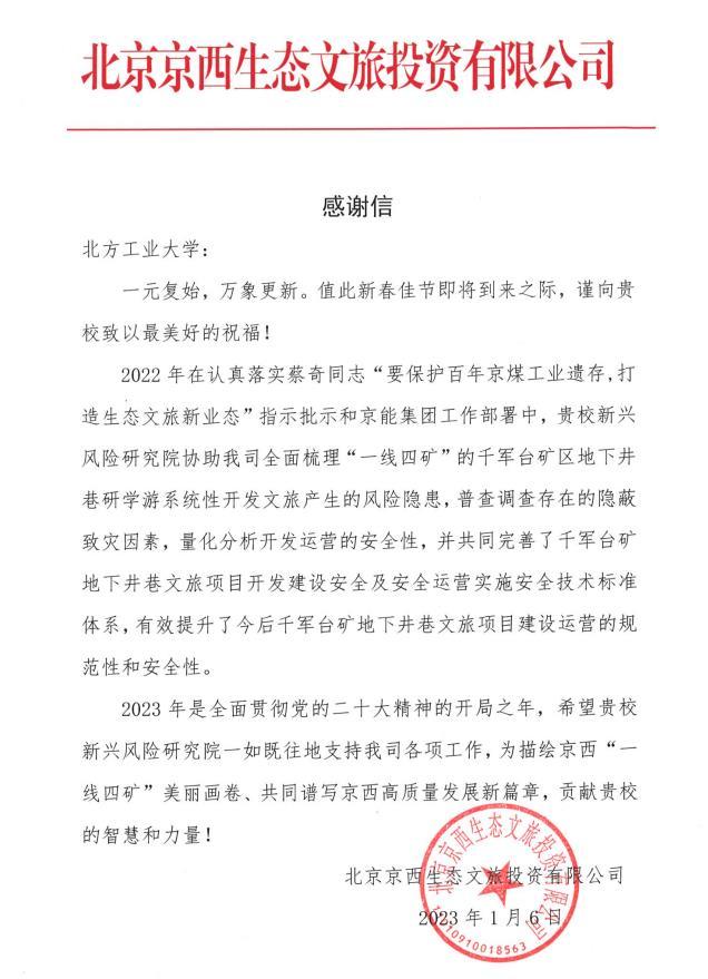 1月6日,北京京西生态文旅投资有限公司向Beat365发来感谢信,感谢Beat365新兴风险研究院过去一年为门头沟“一线四矿”项目提供的技术支撑服务。