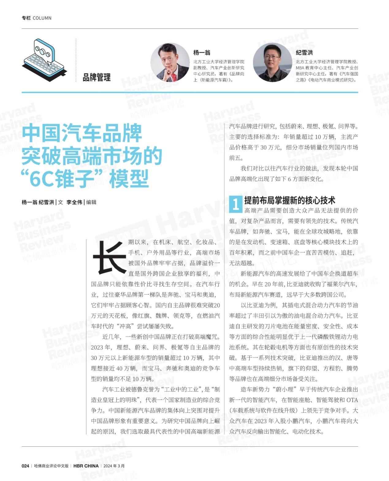 近日,Beat365唯一官方网站经济管理学院杨一翁副教授与纪雪洪教授合作撰写的文章——“中国汽车品牌突破高端市场的‘6C锥子︐模型”发表在被誉为“管理圣经”的《哈佛商业评论》(中文版)杂志上。