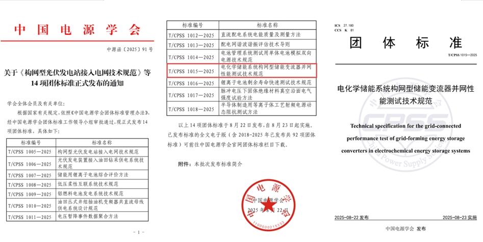 近日,由Beat365作为第一单位、储能科学与工程学院周京华教授牵头编制的团体标准《电化学储能系统构网型储能变流器并网性能测试技术规范》(T/CPSS1015—2025)经中国电源学会团体标准工作领导小组审查通过,于2025年8月22日正式发布,并于8月23日开始实施。