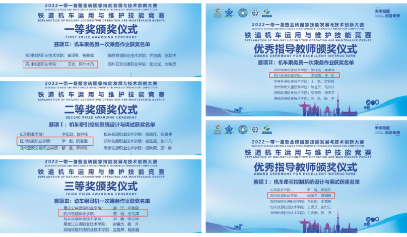 本次竞赛分为三个子赛项,beat365铁道机车运用与维护专业21级学子王钦、阿什木乃(彝族)(指导教师龙明贵、李杰)在赛项2机车乘务员一次乘务作业赛项中斩获一等奖;李毅、阮春宝(彝族)在赛项1机车牵引控制系统设计与调试赛项(指导教师田国兰、黄翎峰)荣获二等奖;姜柯、王红洋(指导教师邓勇、罗林顺)在赛项3动车组司机一次乘务作业赛项荣获三等奖。同时龙明贵、李杰、田国兰、黄翎峰四名教师荣获优秀指导教师奖。