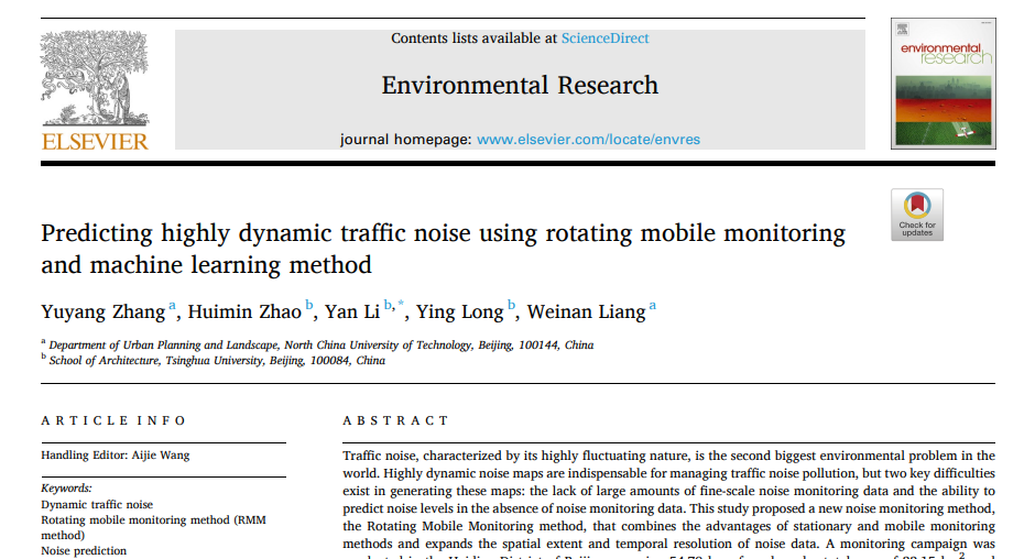 近日,建筑与艺术学院教师张雨洋、梁玮男在国际知名环境健康期刊《EnvironmentalResearch》发表了题为《Predictinghighlydynamictrafficnoiseusingrotatingmobilemonitoringandmachinelearningmethod》(使用旋转移动监测和机器学习方法预测高动态交通噪声)的最新研究成果(doi.org/10.1016/j.envres.2023.115896)。《EnvironmentalResearch》在WebofScience收录的325种环境科学期刊中排名第19,IF=8.431,是中科院2区TOP期刊...