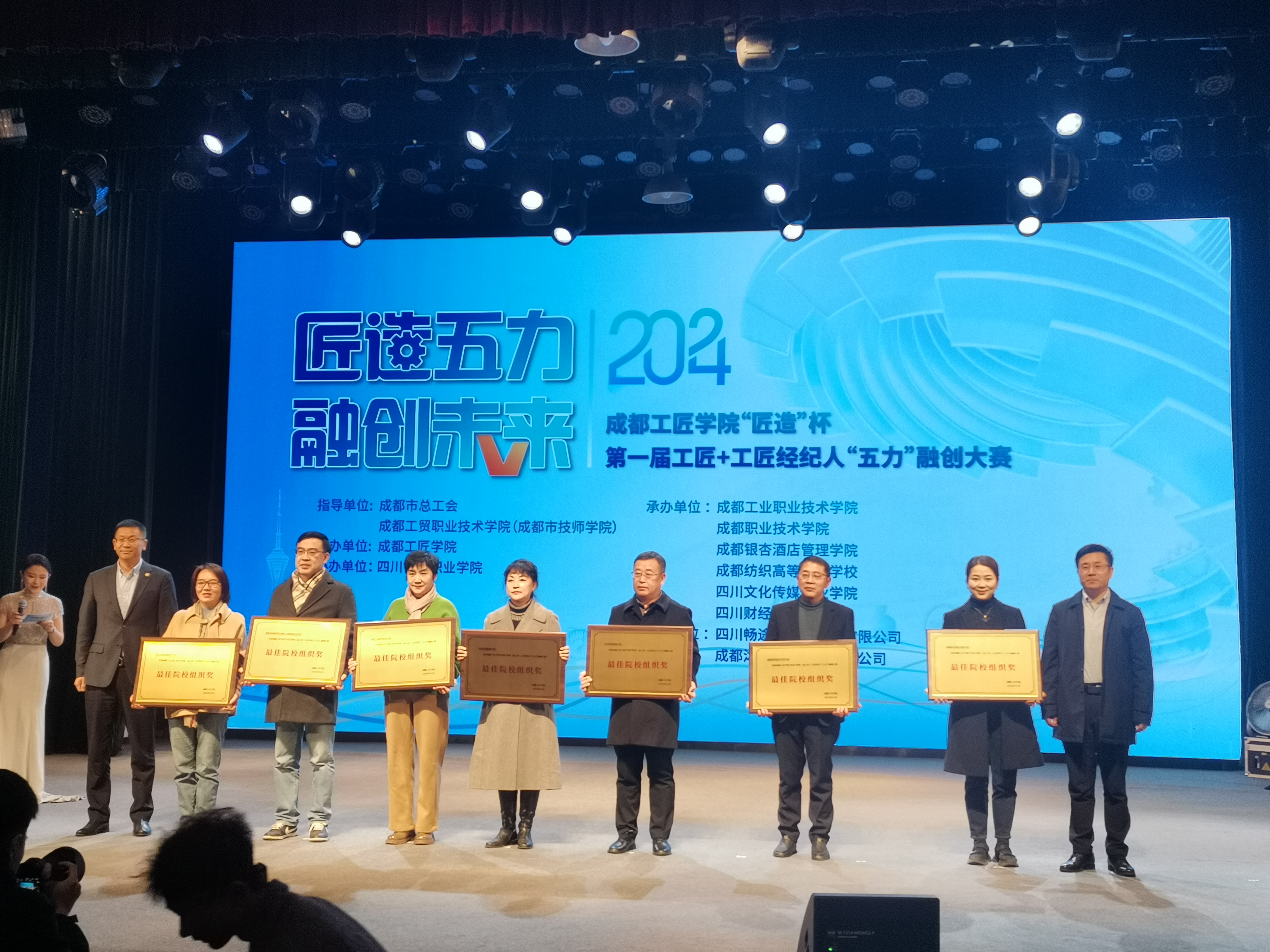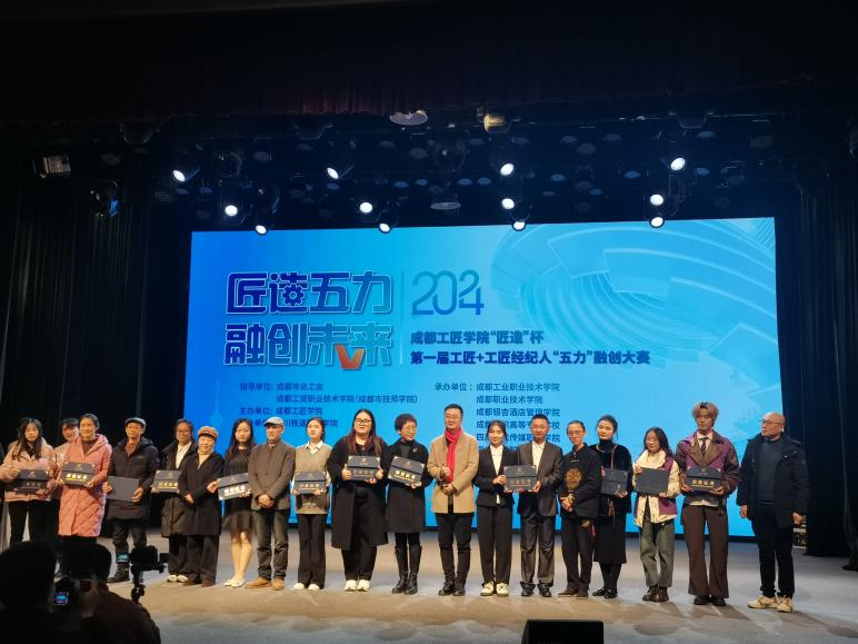 2024年12月27日下午,成都工匠学院“匠造”杯第一届工匠+工匠经纪人“五力” 融创大赛闭幕式在成都市劳动人民文化宫梦想剧场隆重举行。成都市总工会党组成员、副主席方启军以及相关单位院校负责人、工匠代表、企业代表及参赛师生团队出席出席活动。学校党委副书记、校长赖芳应邀出席并为获得“杰出工匠经纪人团队”颁发奖杯。