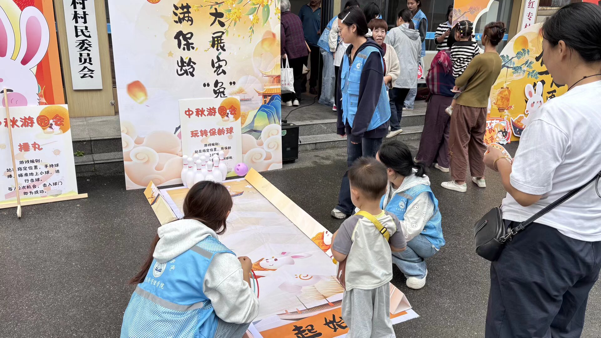 傍晚6时起,村民陆续入场。志愿者分守“签到—集章—兑奖”全流程,发放“中秋通关卡”,引导村民有序参与。广场中央,“大展宏兔”主题背景墙成为首个热门打卡点,志愿者主动为村民拍摄全家福,镜头中灯笼高挂、笑脸洋溢,首张“中秋团圆大片”应运而生。游戏区气氛尤为热烈。保龄球区域,志愿者巧妙利用贴有“月饼”贴纸的水瓶作为目标,耐心指导孩子投掷技巧;捶丸体验区排起长队,志愿者参照古礼示范动作,村民凝神挥杆,每当彩球滚入“月门”,现场便响起阵阵喝彩。村民李阿姨三击全中,喜悦地说道:“没想到传统游戏这么有趣!”