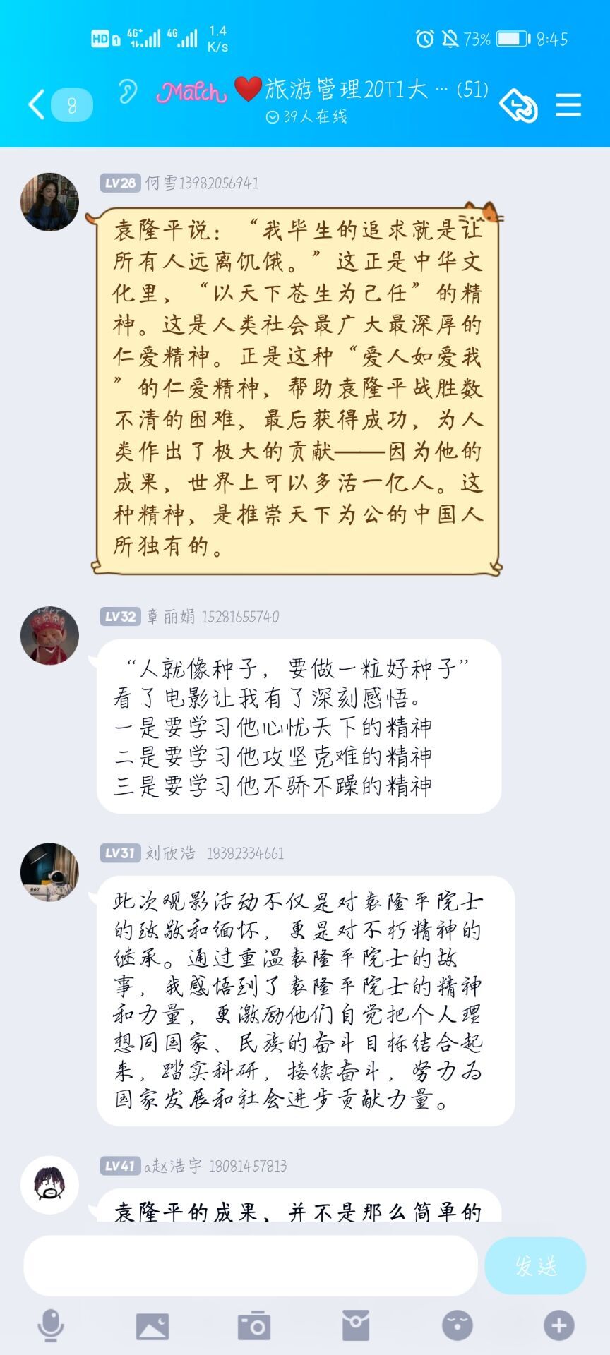 播放完视频后,班级同学集体沉痛悼念袁爷爷,气氛悲伤凝重,英雄精神深深感染着青年学子,坚毅力量悄悄深埋在同学心中。随后全班同学在班群踊跃发言,抒发内心对袁爷爷伟大一生的感想与敬意。