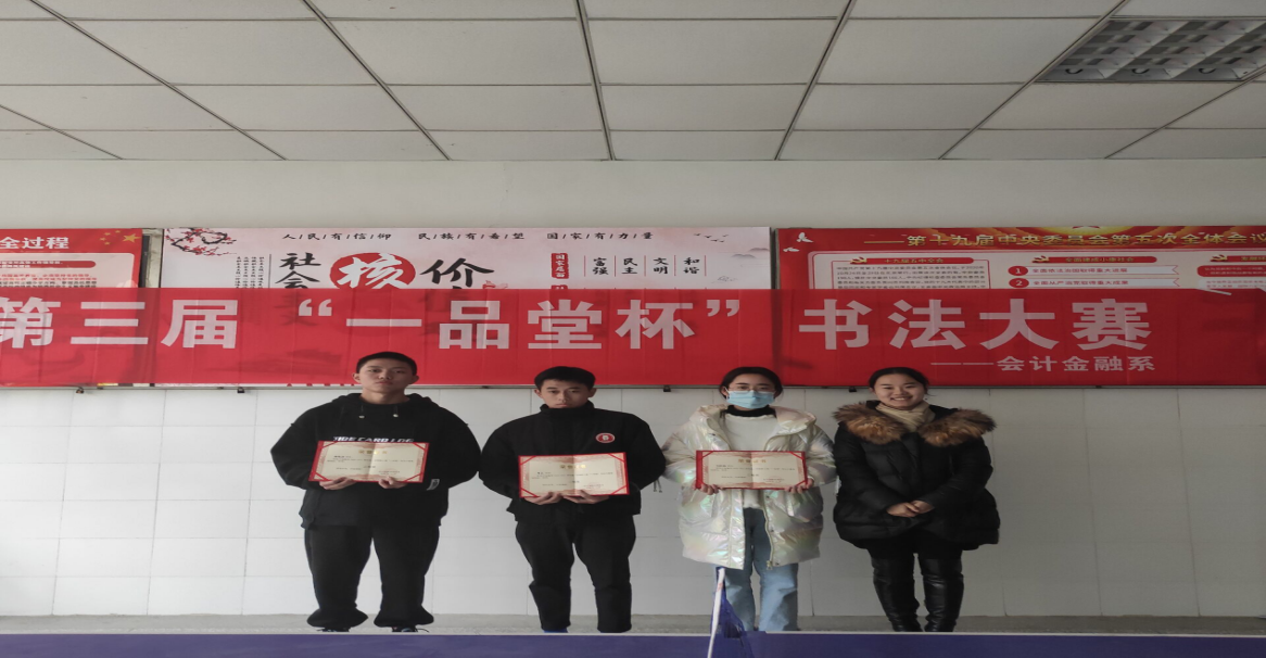 为弘扬中国传统文化,传承书法风采,促进我系文化建设,2020年11月20日,会计金融系学生会宣传部和学习部共同举办了第三届“一品堂杯”书法大赛。13位同学参加了此次比赛。