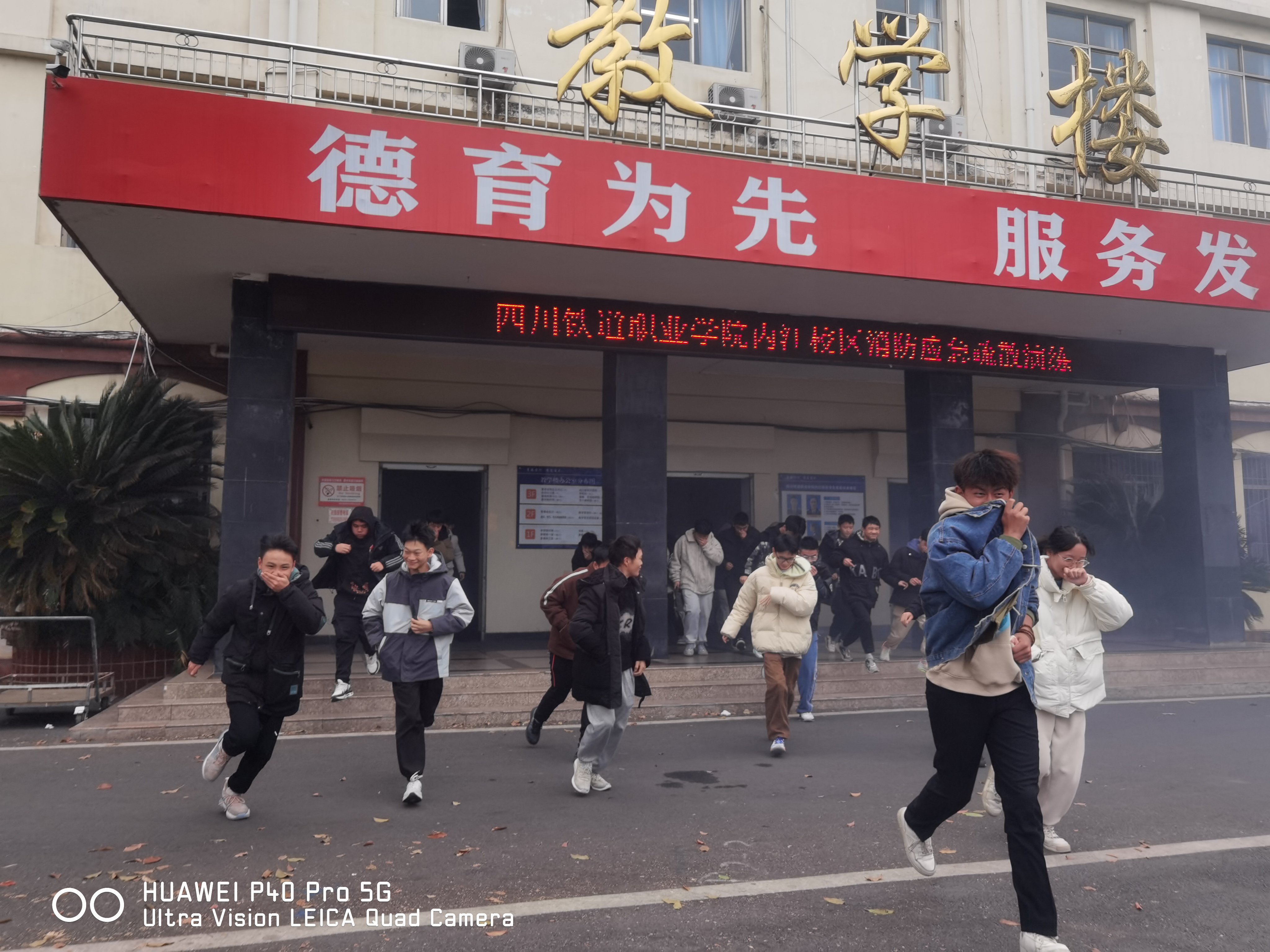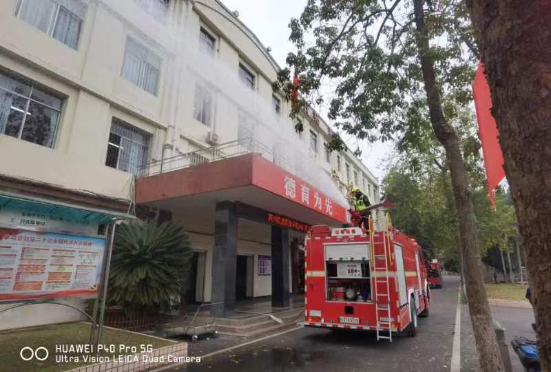 演练开始时,随着烟雾弹的点燃,警铃骤响,教室内各班班主任迅速组织学生紧急疏散。同学们立即掩住口鼻、弯腰低头,按照消防安全疏散路线迅速有序撤离。楼道上负责疏导的教师指挥学生保持秩序,逐次疏散到指定安全集合点。随即,内江市经开区消防大队立即组织2台消防车进行消防救援及喷水灭火。灭火完毕后,全体学生又返回寝室,再次进行学生公寓的消防疏散演练。整个过程井然有序、快速高效,切实增强了师生的避险逃生和自救互救能力。