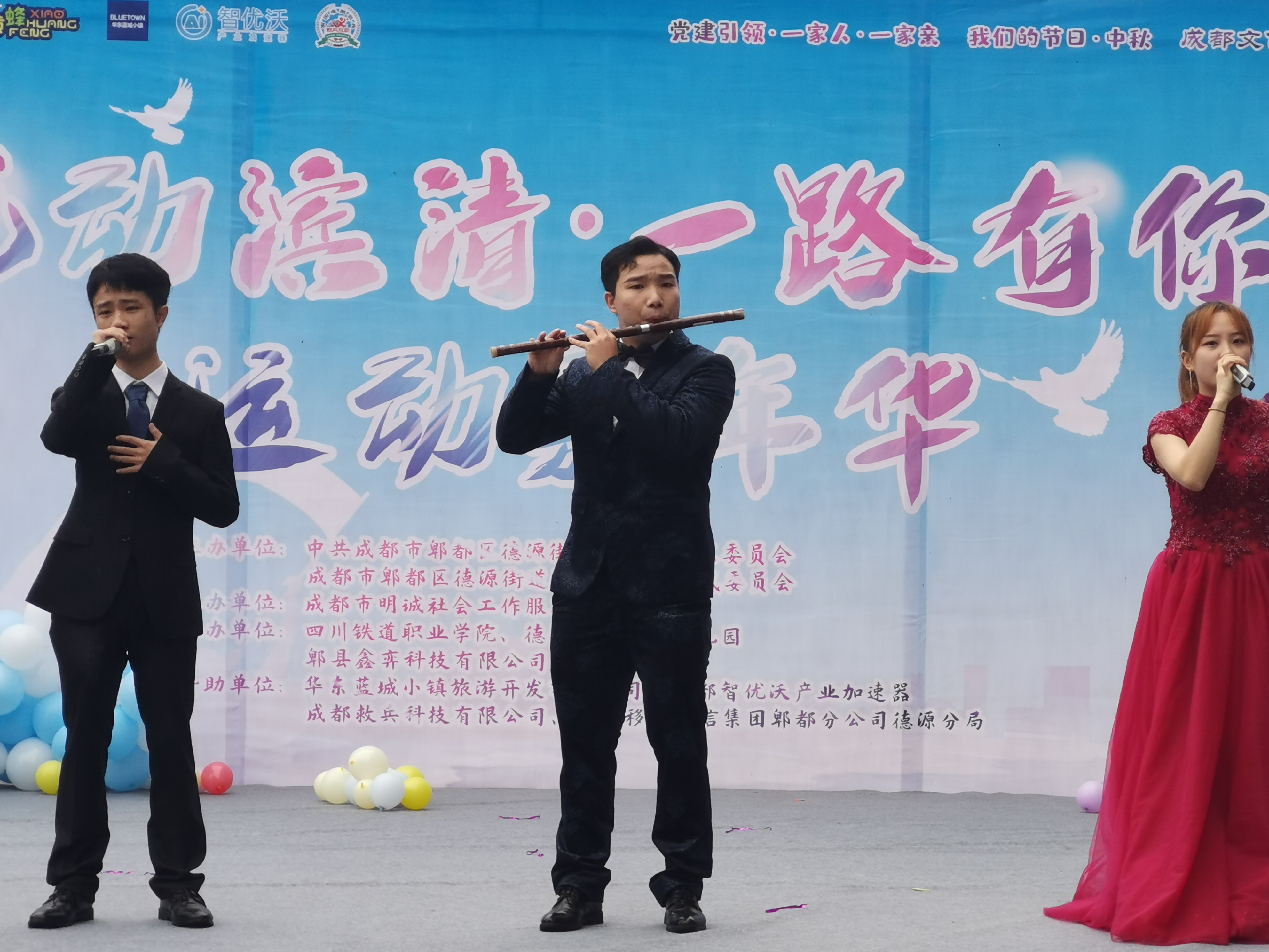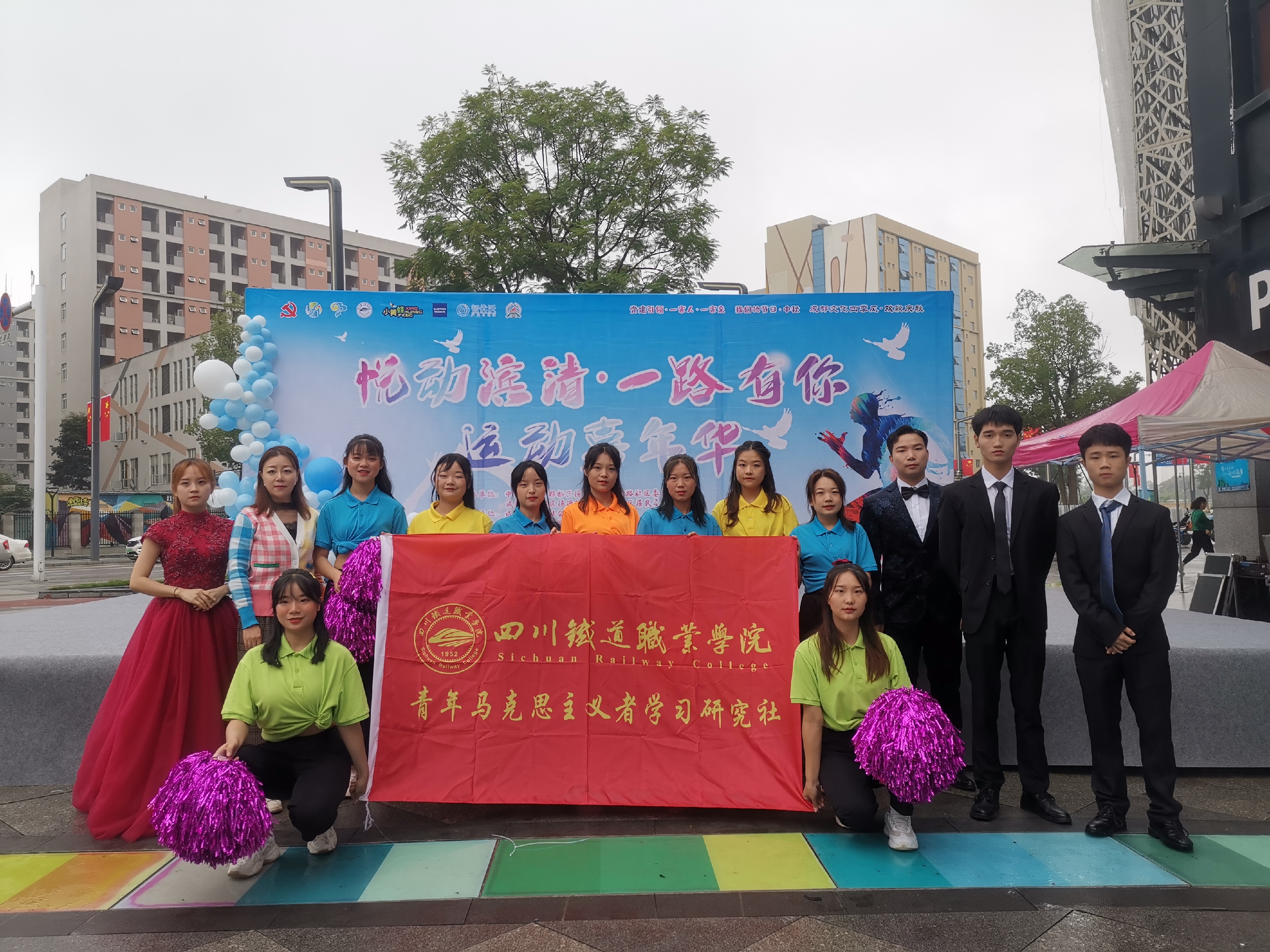 在国庆中秋双节来临之际,受郫都区德源街道滨清路社区、郫筒街道岷阳社区邀请,青年马克思主义者学习研究社(以下简称“青马社”)参加了上述两个社区举办的“悦动滨清·一路有你”运动嘉年华、“迎中秋庆国庆·同圆幸福家园梦”大型文艺汇演,实现“校社”共建共育,9月27日上午,13名青马社学生代表在思政部龙燕老师的带领下参加了此次活动。
