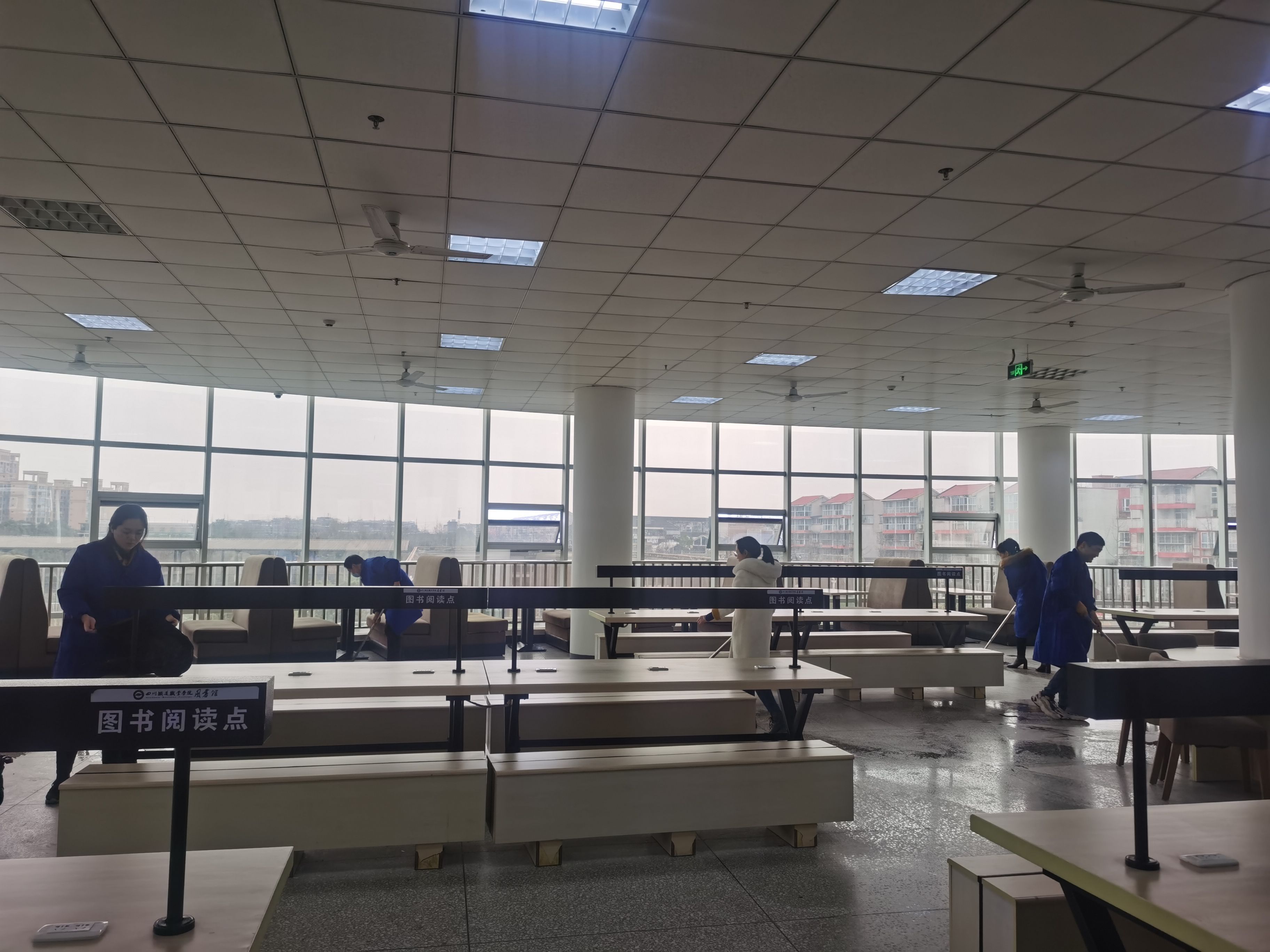 会后,科室组织全体老师对各借阅室、阅览区、桌椅、书架、玻璃、地面和墙角等区域进行全面清扫,并进行安全检查,做到安全隐患排查和卫生不留死角,全力做好开馆各项准备。