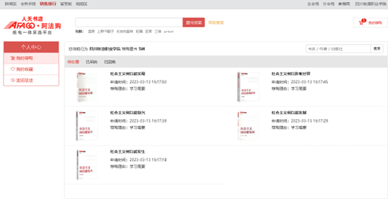 2、高级检索:可同时满足多项检索条件,筛选出需要选购的书目。 3、馆配电子书:关联电子书平台,如需采购电子书可联系平台客服。 4、我的荐购:【个人中心】→【我的荐购】中可查看到所有的荐购书目,及图书馆的采纳情况。