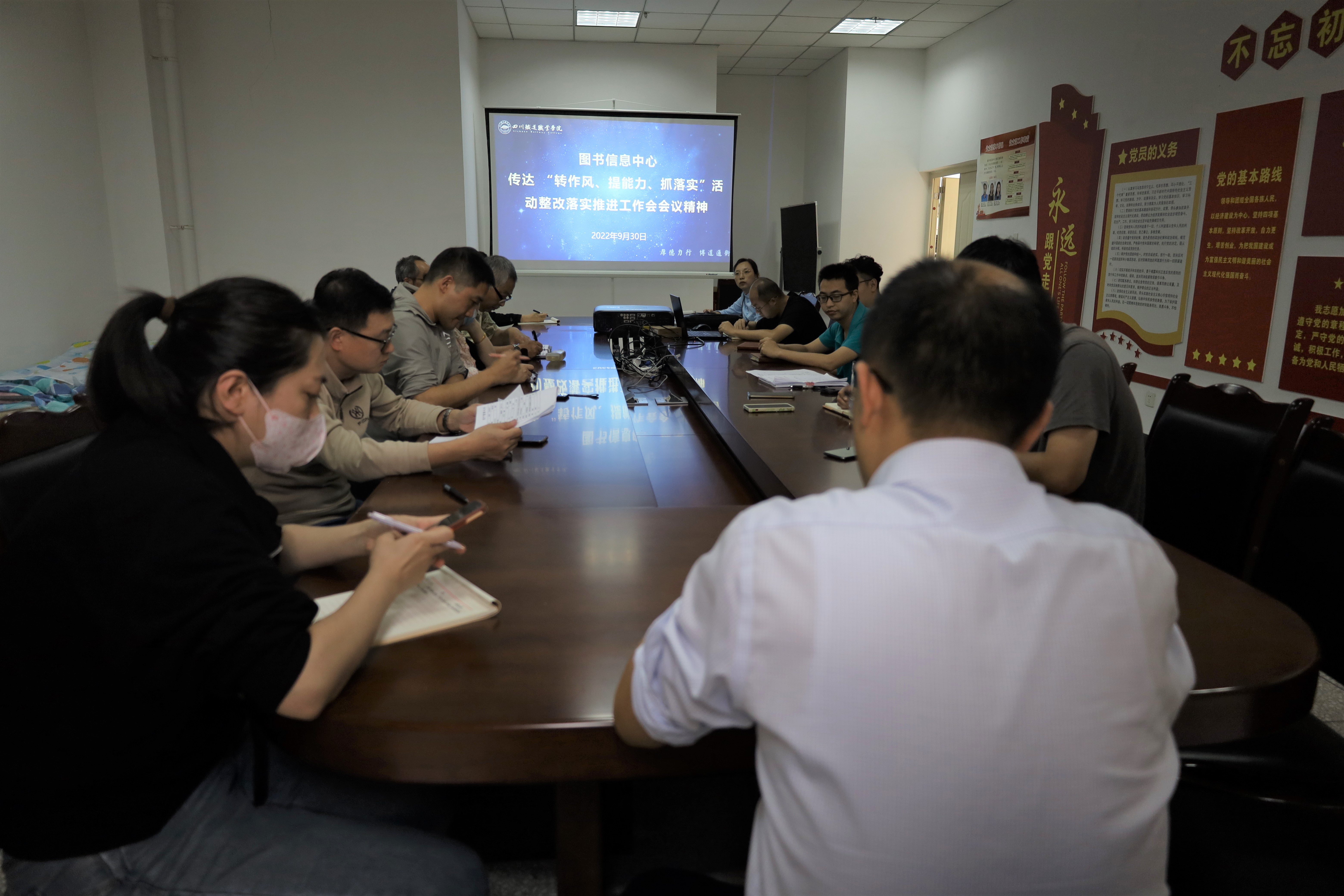 为认真传达学习全省高校党的建设推进暨“转作风、提能力、抓落实”活动整改落实推进工作会精神。9月30日下午,图书信息中心召开专题会议。党支部书记何中华主持,部门全体人员参会。