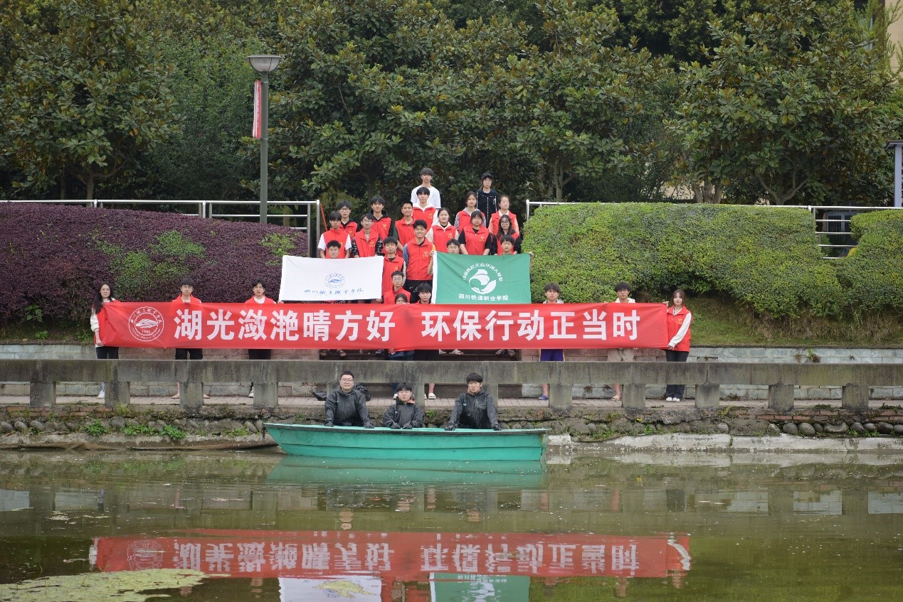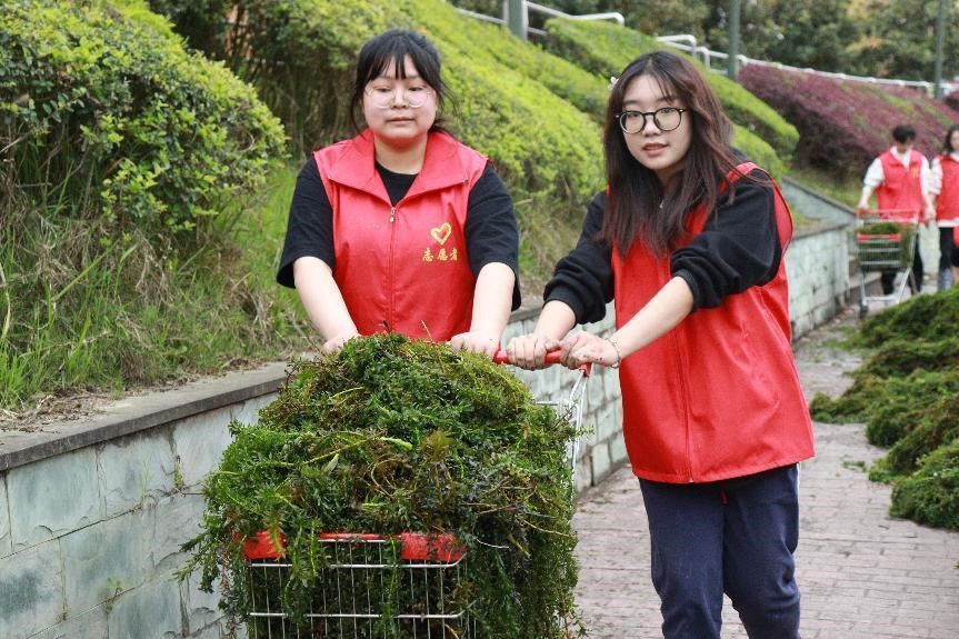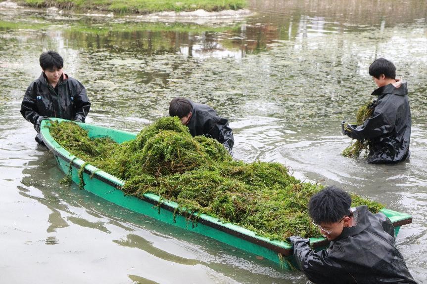 活动中,志愿者分工明确,行动有序。在后勤处工作人员指导下,男生穿上下水服清理水草,女生在岸上将捞上来的水草运输到指定地点。大家秉承“奉献、友爱、互助、进步”的志愿服务精神,不怕苦、不怕累,团结协作、勇于担当,通过集体义务劳动让揽月湖的湖水更加清澈,也让自己追求向上向好的内心更加明亮。