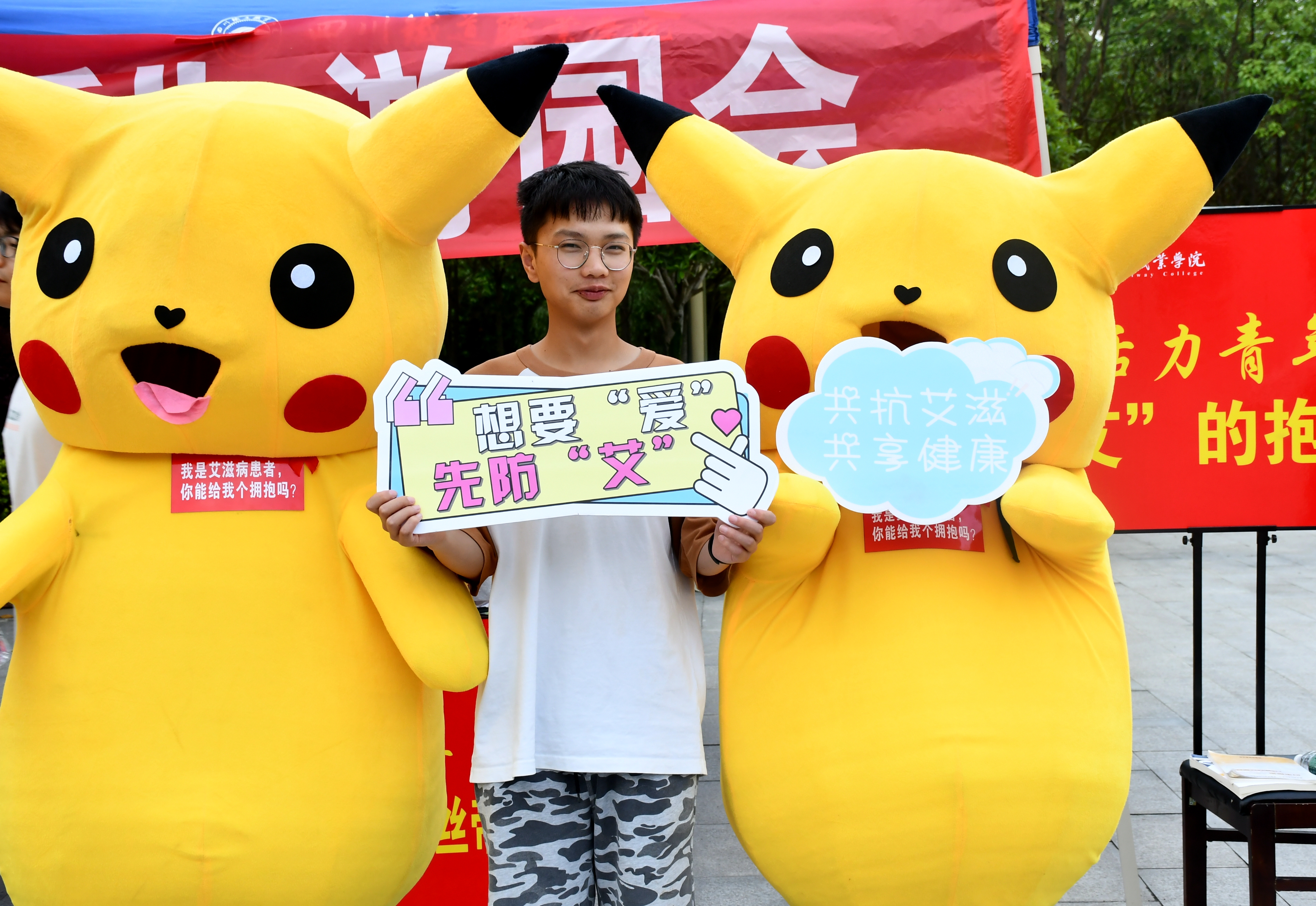 “艾”的抱抱。“我是艾滋病患者,你能抱抱我吗?”志愿者们穿上玩偶服,扮成艾滋病患者,向同学们索要拥抱。同学们热情地与“艾滋病患者”拥抱,以实际行动消除对艾滋病患者的歧视,以正常的眼光去看待他们,用真诚的怀抱去温暖他们。