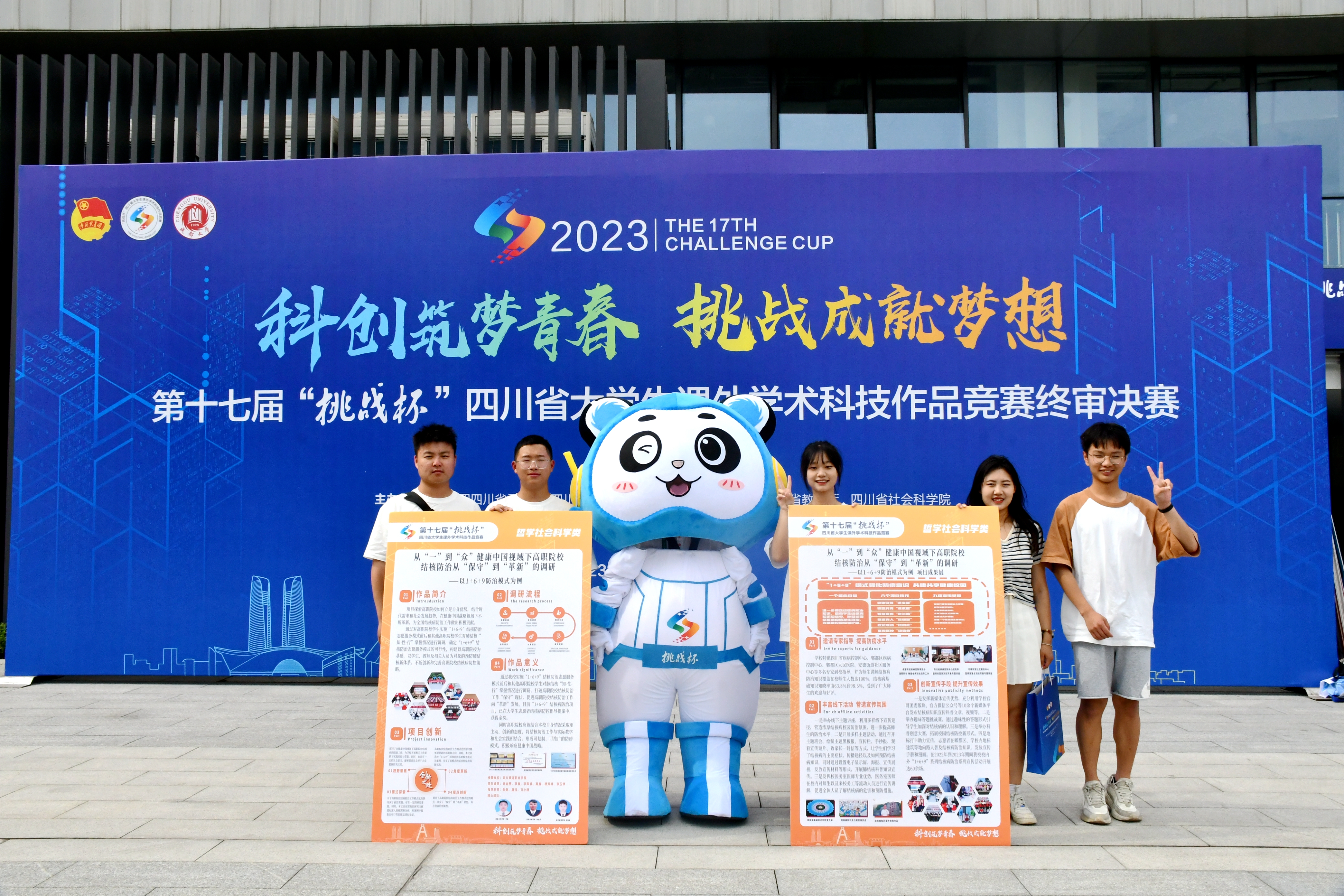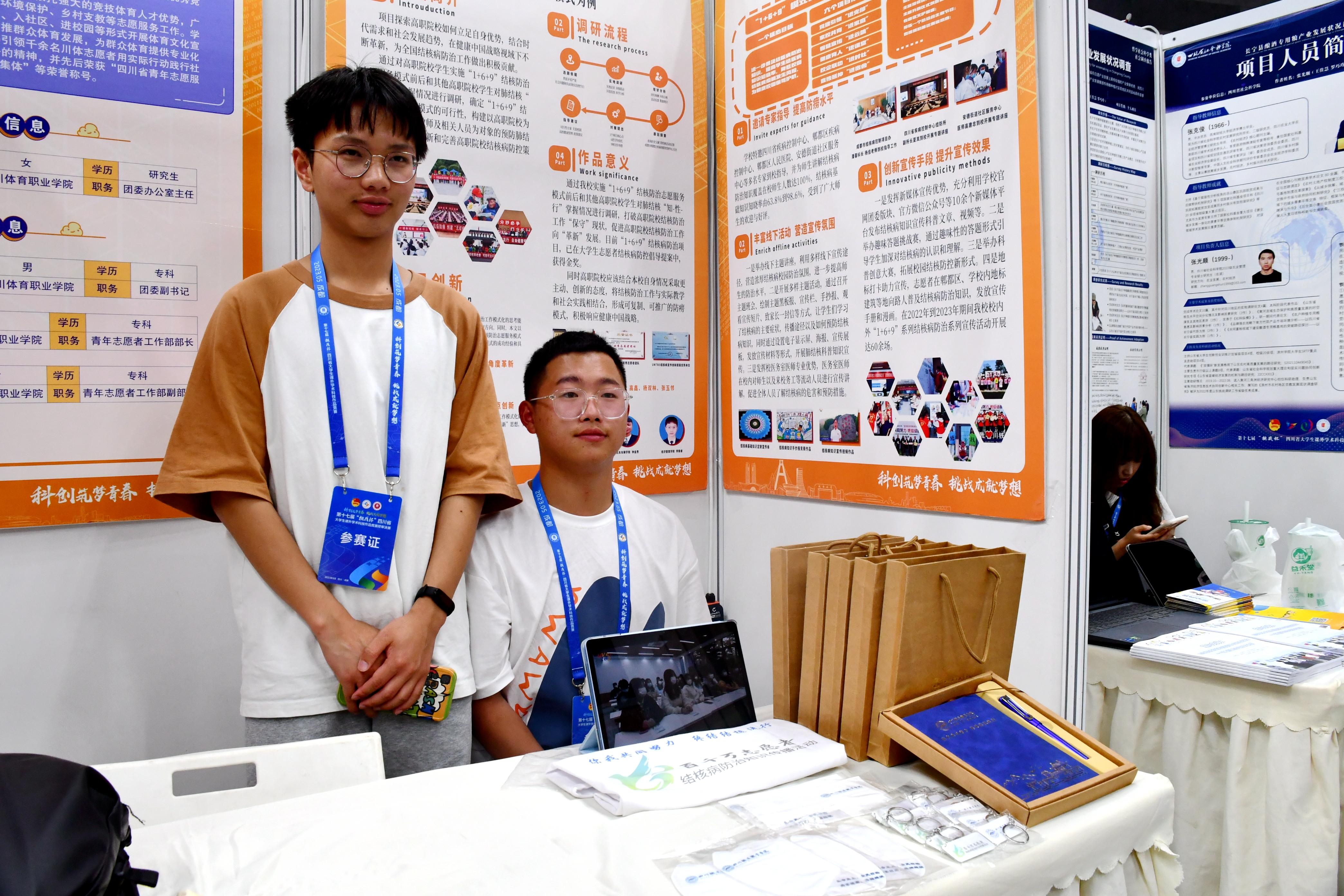 beat365钟金焘、李鑫、李陈睿等同学的团队作品《从“一”到“众”健康中国视域下高职院校结核防治 从“保守”到“革新”的调研--以1+6+9防治模式为例设计》进入本次“挑战杯”终审决赛。由团委书记朱俐老师领队,学生处唐恬老师、辅导员刘小杨老师共同带队前往成都大学进行现场路演与展示。整个项目展演期间,该作品备受瞩目,以1+6+9防治结核志愿服务为案例,将结核防治工作与实际教学和社会实践相结合,形成可复制、可推广的模式,受到了诸多高校老师、同学的咨询与探讨,也受到了评委专家的驻足常看和兴趣。