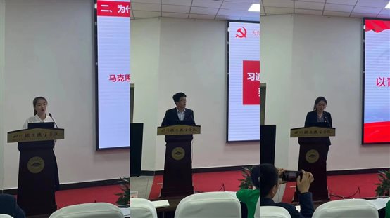 会议集体观看了习近平总书记在中国人民大学考察期间以及习近平总书记在庆祝中国共产主义青年团成立100周年大会上的重要讲话;思政部王彩霞同志以《用马克思主义为大学生青春之路导航》为题讲了一堂生动的思政课;学生处李旗同志和校团委易诗同志分别以《以“四气”培养学生》和《牢记领袖嘱托 勇担青春使命》为题作了交流发言,与会代表也就会议学习内容作了现场交流发言。