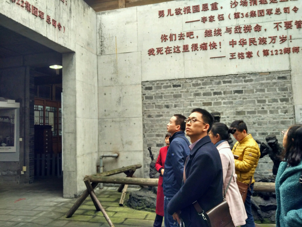 建川博物馆共设21个场馆、3个广场,内容极其丰富。当天上午,大家在讲解员的引导下,集中参观了壮士群雕广场、中国老兵手印广场、正面战场馆、川军抗战馆、三寸金莲馆、红色年代生活用品馆等。两千多名革命老兵的鲜红手印以“V”字型(代表胜利)排列,两百多名抗日名将的群雕屹立眼前,历史照片和文物一一陈列,仿佛带领大家回到了那个战火纷飞、保家卫国的革命年代。大家一边听着讲解员的细致讲解,一边相互交流、做着笔记。那些舍生忘死、浴血奋战、为国家和民族独立流血牺牲的仁人志士,让人肃然起敬。当天下午,参观人员进行分组参观,2-3人一组,大家用笔记本记录、手机拍摄,留下每一个细节,以便后期研讨。同时,学生处和团委的老师与建川博物馆的相关负责人就建立德育实践基地等问题进行了讨论。