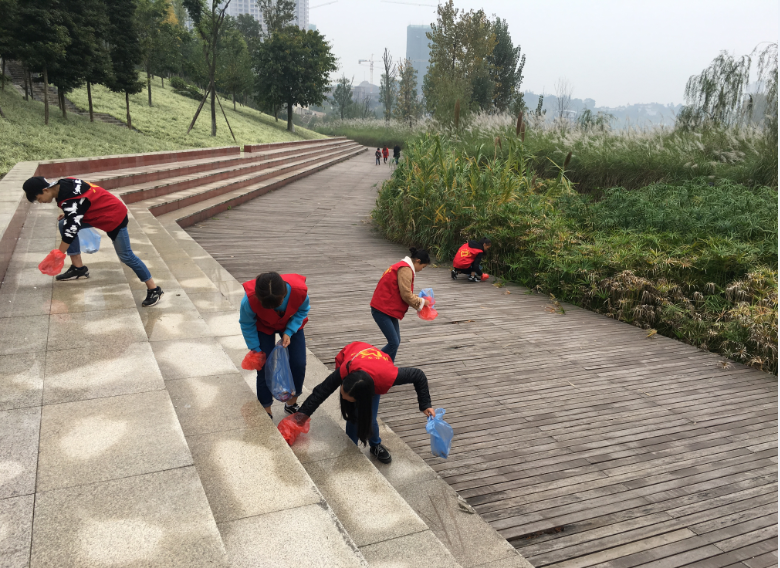 上午九点,24名志愿者来到内江市谢家河湿地公园,分为三个小组,从公园的中部向两侧进行清扫。草丛中的烟蒂、道路上的纸屑、栈道上的果皮、芦苇丛中的饮料瓶,同学们认真地搜索着,将每一个垃圾拾起,并装入垃圾袋,再统一扔进垃圾箱。在清扫的同时,还进行了环保宣传,发现乱扔垃圾或随地吐痰的市民,立即上前劝阻,并得到了良好的配合。经过两个多小时的努力,志愿者们走遍了公园的每一个角落,整个公园在秋日阳光的照耀下,显得更加干净整洁了。