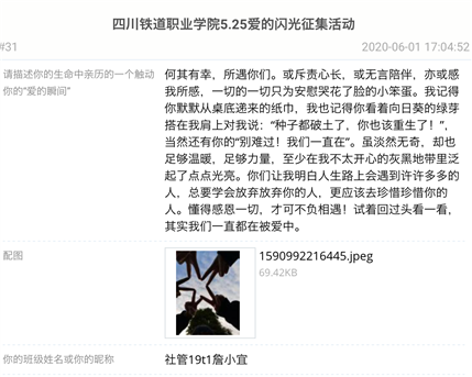 “爱的闪光”网络图文征集活动引导学生感受、表达生命中感受过爱的瞬间,通过发现爱、珍惜爱、分享爱,收获成长和前进的力量,提升对生命的热爱,并对优秀来稿在学院微信公众号进行展示。学生或回顾自己与身边人的爱的传递,或讲述抗疫期间中华大地上涌现出的打动自己的大爱,通过网络将自己对爱和生命的体会进行真挚的分享交流,总计收到学生来稿102篇。